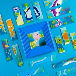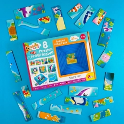 Puzzle-urile progresive CAROTINA Baby le aduc copiilor bucuria asamblării încă de la primele încercări. Fiecare dintre cele 8 puzzle-uri are un număr diferit de piese și crește treptat nivelul de dificultate, astfel încât copilul își dezvoltă natural abilitățile fără frustrare. Ilustrațiile tematice din lumea marină stimulează curiozitatea și jocul.