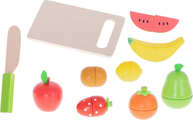 Fructele pot fi tăiate în bucăți mai mici folosind cuțitul de jucărie inclus în set. Pune-le pe placa de tăiat și separă-le. Fructele colorate atrag atenția și mâinile mici... ca un magnet! Bucățile separate se pot reuni cu ușurință, deoarece piesele sunt echipate cu magneți, iar distracția începe din nou!