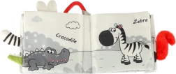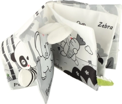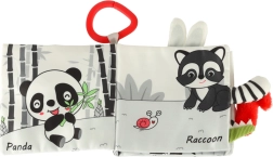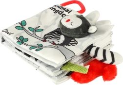Cu această carte moale în culori contrastante, micuțul tău pornește să descopere lumea animalelor – de la bufniță la maimuță și panda până la raton, elefant, crocodil sau zebră. Elementele alb-negru și roșii susțin stimularea vizuală timpurie, în timp ce texturile variate și elementele interactive dezvoltă motricitatea fină și coordonarea mână–ochi. Fiecare pagină conține denumirile animalelor în limba engleză, ceea ce susține în mod natural primele achiziții de vocabular.