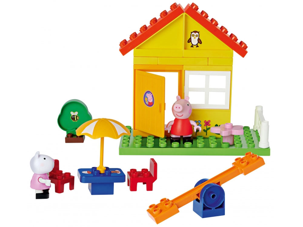 Set de construcție vesel inspirat de povestea PEPPA PIG, aduce 26 de piese colorate din care copiii pot construi o căsuță cu grădină și loc de joacă. Include figurinele Peppa și Suzy pentru jocuri de rol. Se asamblează și se demontează ușor, piesele sunt ideale pentru mâini mici și dezvoltă creativitatea, motricitatea fină și imaginația.