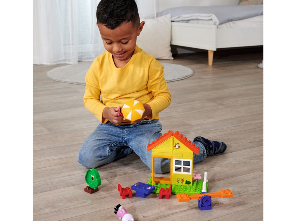 Piesele sunt ușor de conectat și plăcute la atingere, fiind perfecte pentru preșcolari. Setul dezvoltă motricitatea fină, coordonarea mână–ochi și recunoașterea culorilor și formelor. Pentru și mai multă varietate, este compatibil cu alte seturi de construcție similare.