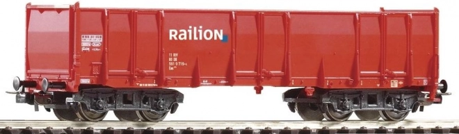 Acest model de vagon înalt cu pereți Eas aduce detalii realiste și o construcție robustă pentru exploatare zilnică. Datorită schemei RAILION (DB AG) și inscripționării precise, completează excelent garniturile de marfă ale epocii V.