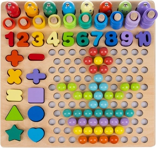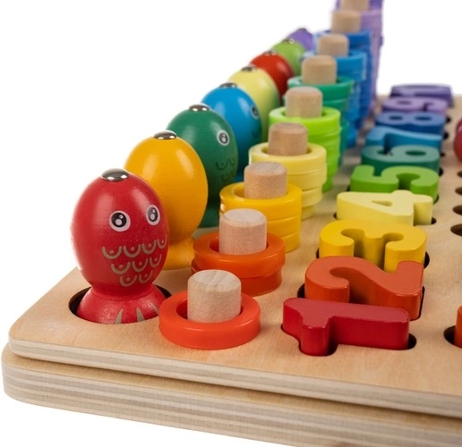 Acest set educațional complex din lemn combină mozaicul cu mărgele, asamblarea formelor și pescuitul magnetic. Copiii exersează într-un mod ludic număratul, sortarea culorilor și recunoașterea formelor, dezvoltând totodată motricitatea fină și prinderea cu ajutorul pensetei, bețișoarelor și linguriței. Potrivit pentru joacă independentă sau învățare împreună cu părinții.