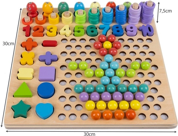 Setul include șabloane față-verso, cifre, simboluri matematice și inele, precum și bile colorate pentru construirea de modele. Datorită bazei din lemn, jucăria este rezistentă și stabilă, iar culorile vii stimulează creativitatea, astfel încât copilul asimilează cu ușurință bazele matematicii.