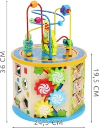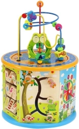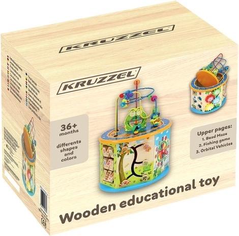 Partea superioară, cu labirintul de mărgele, poate fi folosită pentru antrenarea prinderii și a motricității fine, iar panourile laterale oferă sortator de forme, roți dințate, abac, numere, labirint și alte activități. Partea inferioară ascunde jocul de masă „Nu te supăra, frate” cu pioni și zaruri incluse – ideal pentru distracție în familie.