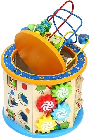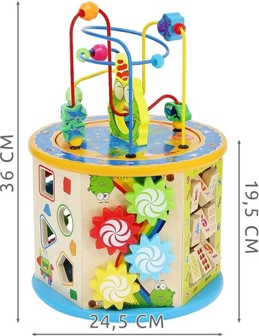Labirint cu bile, sortator de forme, roți dințate, abac, numere, ceas, labirint și panou de joc – toate într-un singur cub stabil.