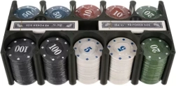 Tot ce ai nevoie pentru un turneu acasă: 200 de jetoane, 2 pachete de cărți, jetoane funcționale și suprafață de joc într-un singur set portabil.