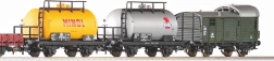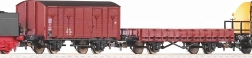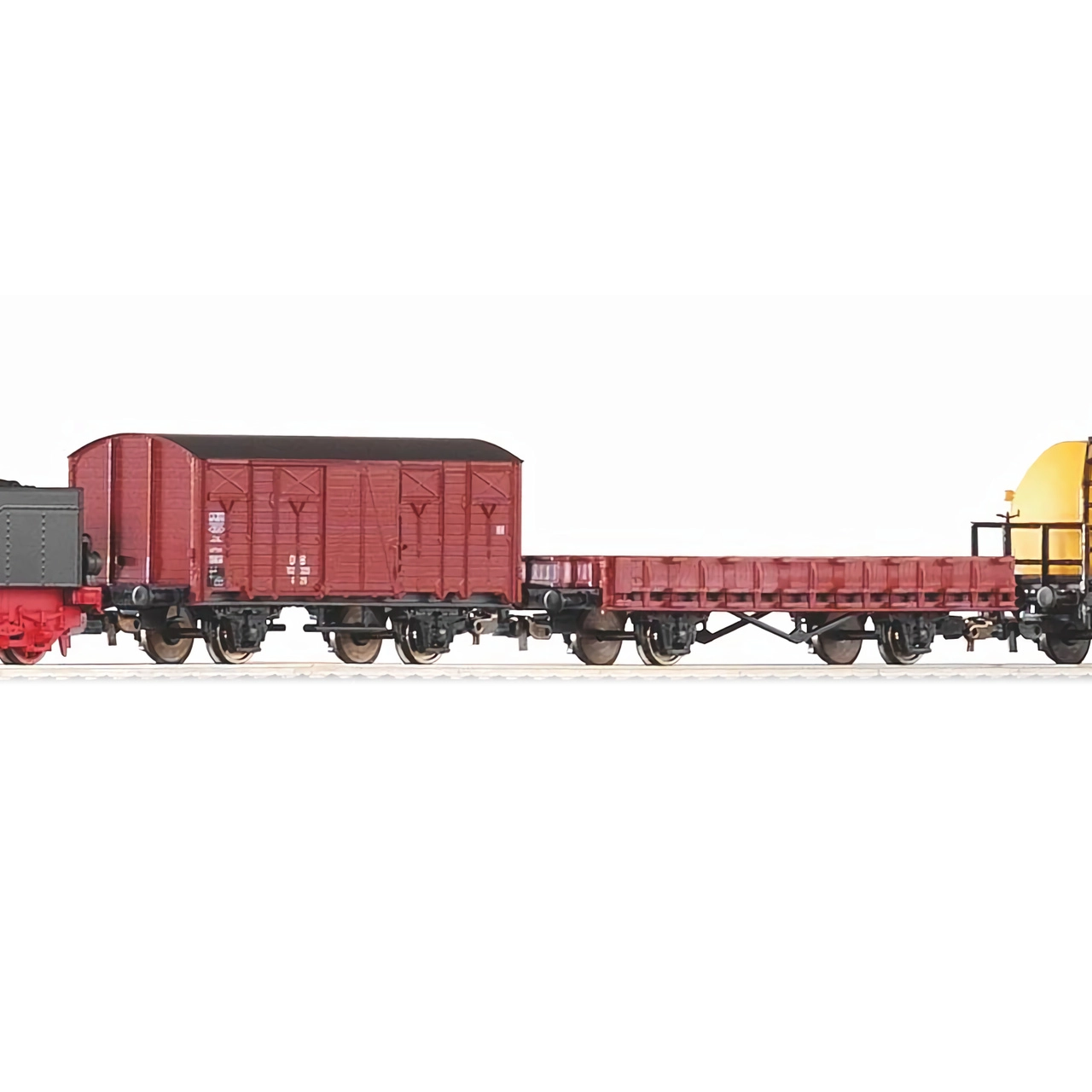Garnitura include un mix de vagoane de marfă DB din era III – vagon acoperit, vagon platformă și cisterne – pentru compuneri variabile și scenarii realiste de marfă pe traseul dumneavoastră.