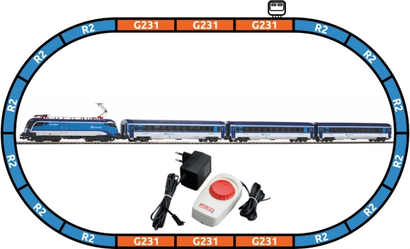 - Conținutul setului: locomotivă electrică ČD Taurus (1×), vagon de călători clasa a 2-a ČD (3×), șine curbe R2 cu terasament (12×), șine drepte G231 cu terasament (5× + 1× cu conectare de alimentare), clemă de alimentare cu terasament, controler analogic de bază cu sursă de alimentare.
