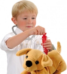 Gentuță compactă pentru micul veterinar, cu un cățel drăgălaș și accesorii practice. Poate servi drept cutie de transport și spațiu de depozitare sigur pentru toate ustensilele. În pachet găsiți un bol, un os și echipament medical de bază. Dimensiunile gentuței: 24 × 15 × 14 cm.