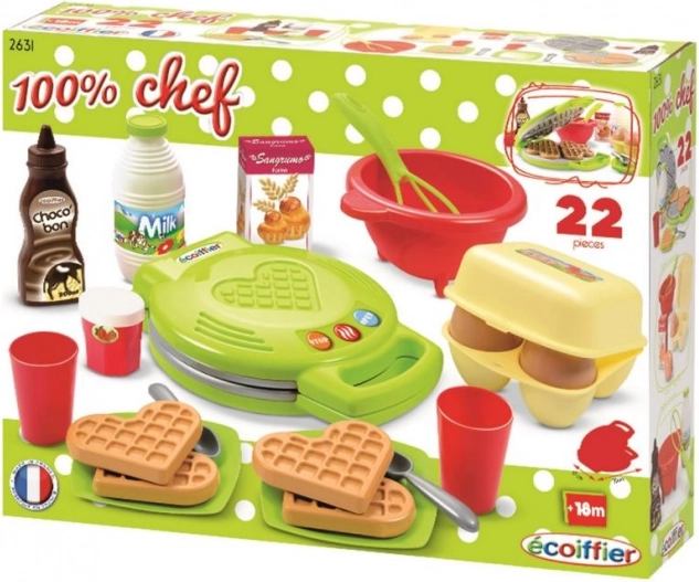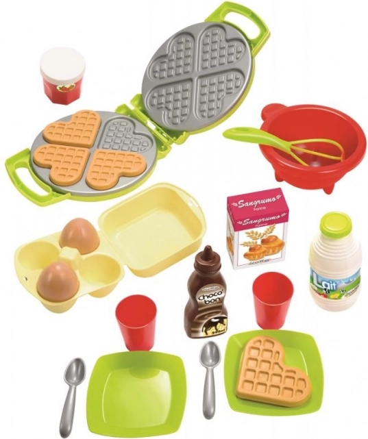 Setul pentru preparare vafe include toate accesoriile necesare pentru a pregăti 4 vafe în formă de inimă pentru cei mici.