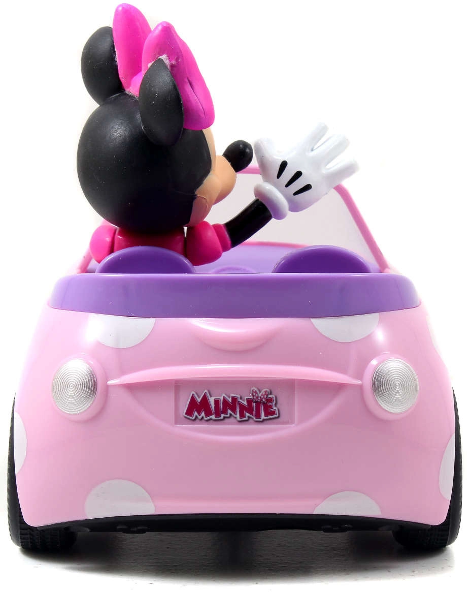 Cabrioletul roz cu buline și figurina MINNIE MOUSE integrată fix stimulează imaginația și jocul tematic.