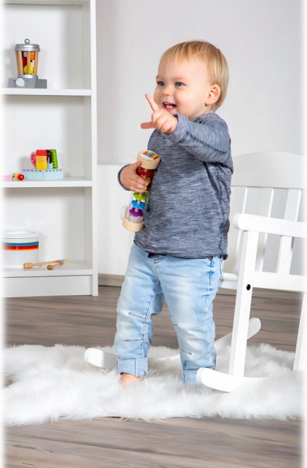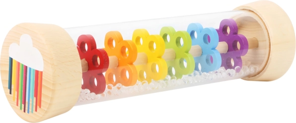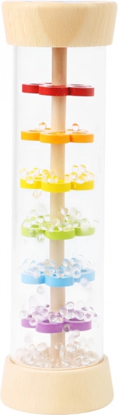 Acest baston de ploaie îmbină lemnul natural și plasticul rezistent într-o jucărie sigură și atrăgătoare pentru cei mici. Prin înclinare sau scuturare se creează un sunet autentic de ploaie fină, care liniștește simțurile copiilor și adulților. Cilindrul transparent dezvăluie biluțe viu colorate și segmente în formă de floare, făcând jocul captivant vizual.