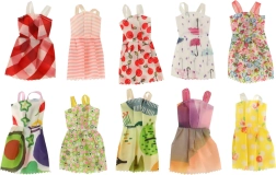 Setul include 10 fustițe pentru păpuși cu diferite modele, cum ar fi dungi, motive florale și abstracte.