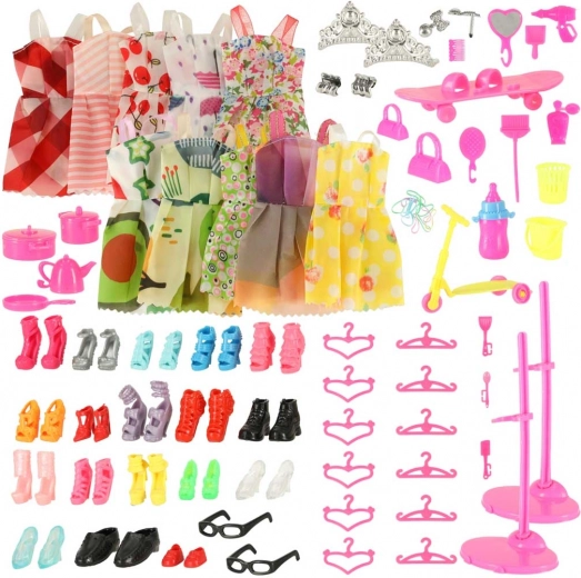 Acest megaset conține în total 85 de elemente, inclusiv 10 fustițe colorate și multe alte accesorii atrăgătoare, cum ar fi pantofi sau coroane. De asemenea, sunt incluse mai multe suporturi mici și umerașe pentru o organizare ușoară a garderobei păpușilor.