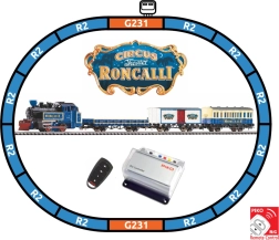 Acest set feroviar complet conține tot ce ai nevoie pentru rulare imediată: locomotivă cu abur, vagon de călători, vagon acoperit și vagon descoperit, oval de șine cu balast și alimentare cu control analogic wireless. Trenul în designul atractiv RONCALLI impresionează prin aspect realist și funcționare fiabilă.