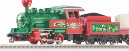 Locomotivă cu abur 0-4-0 cu tender, vagon de călători și două vagoane de marfă într-un design festiv unitar. Perfect pentru a porni instant atmosfera.