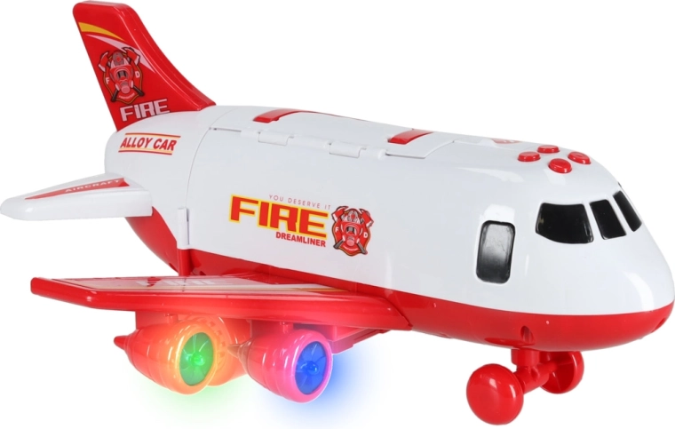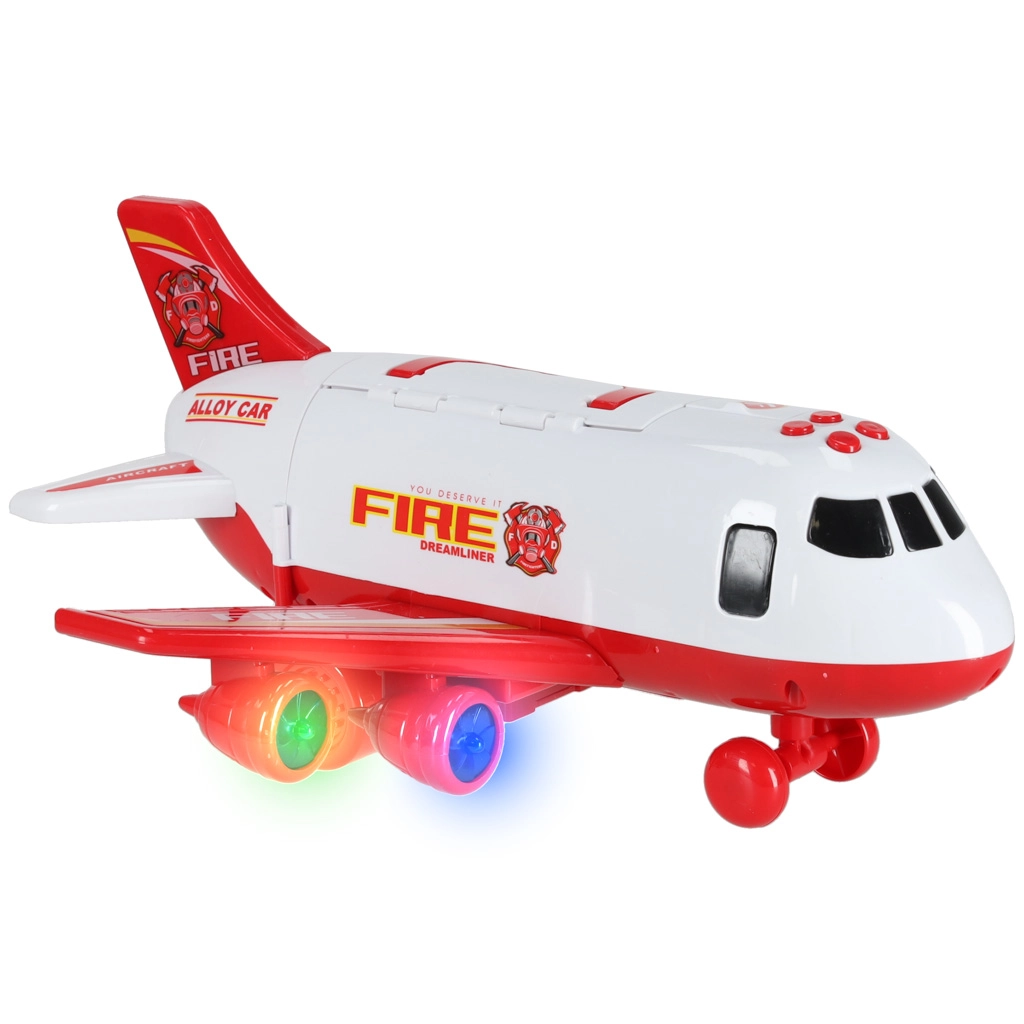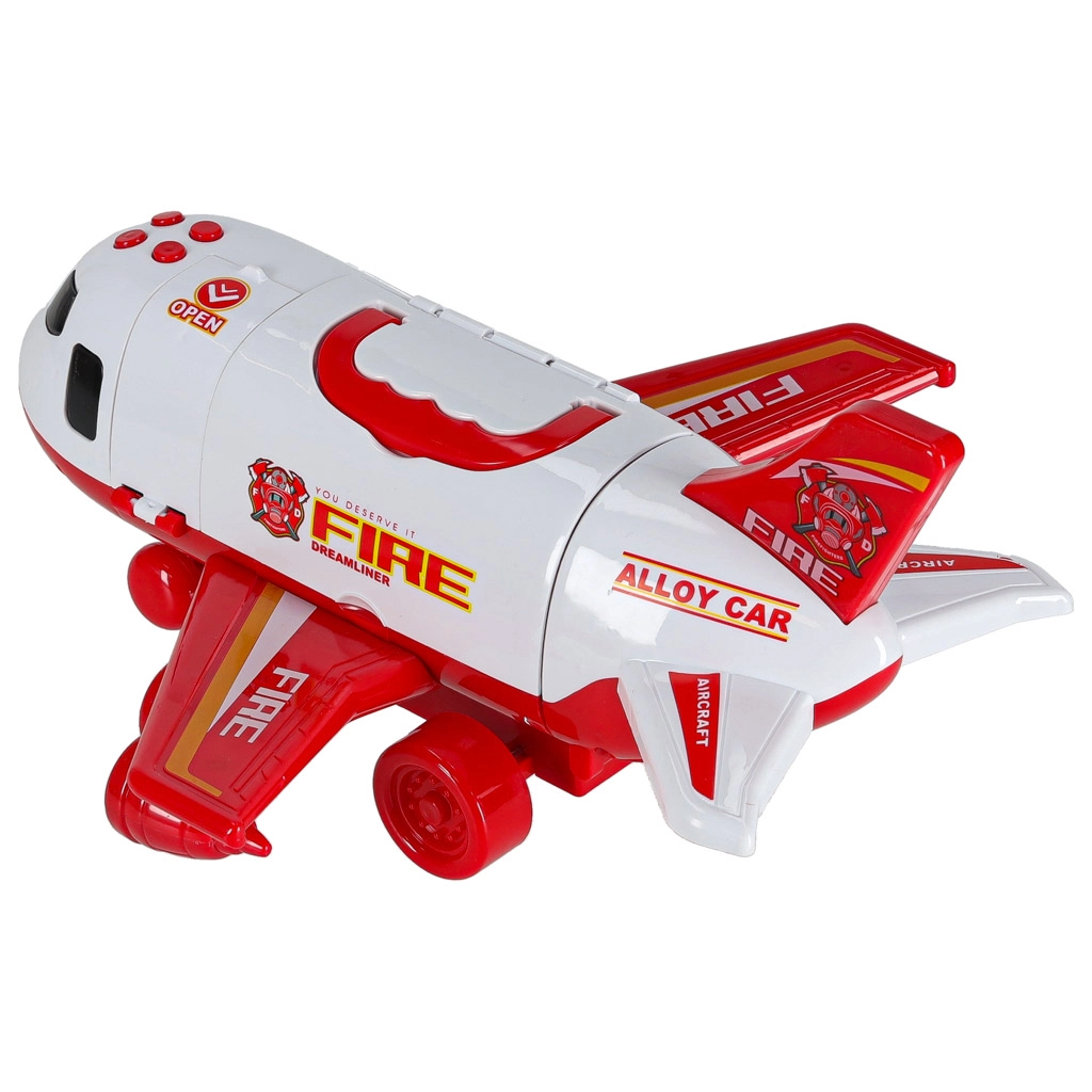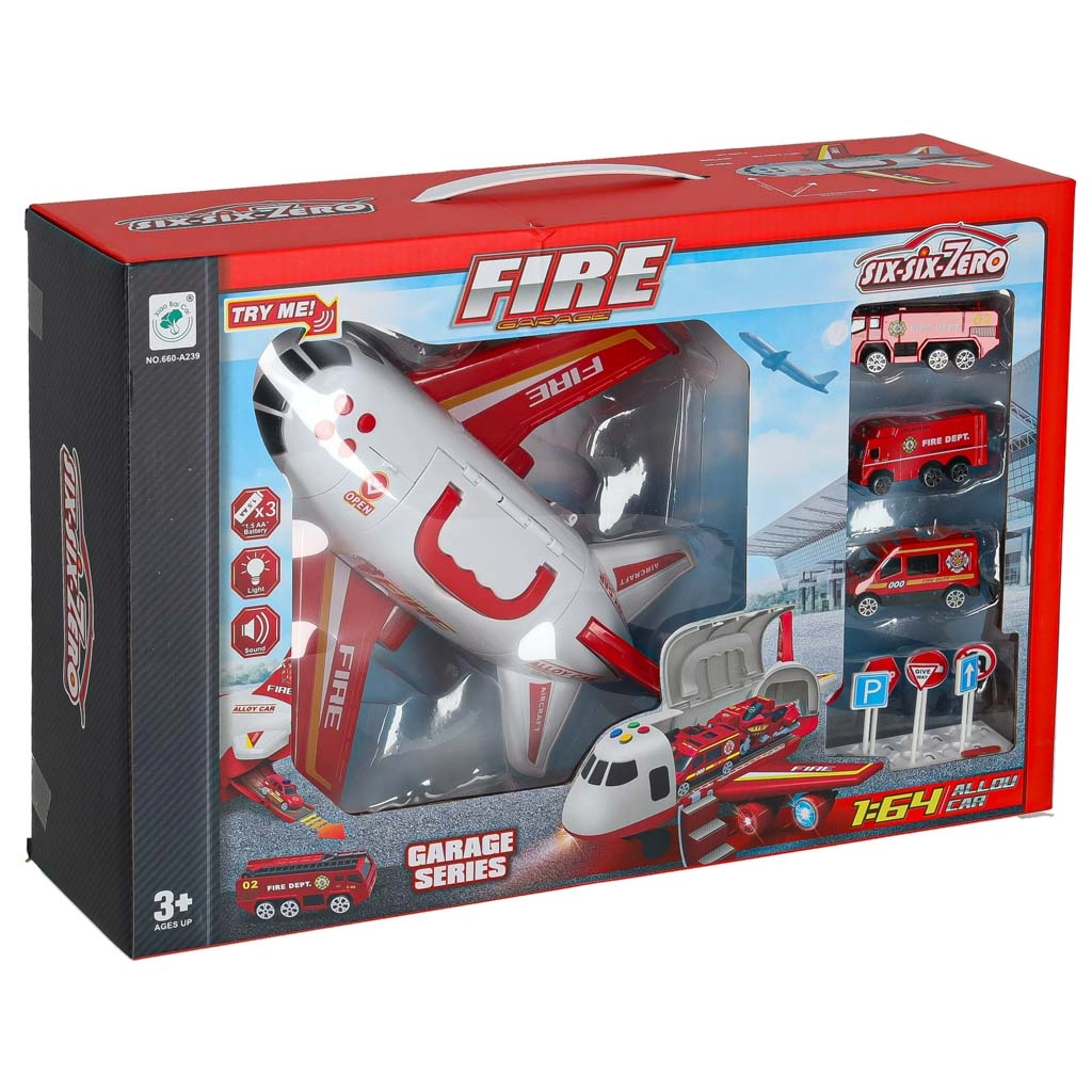 Sunt incluse 3 mașini de pompieri și un set de 7 indicatoare rutiere. Totul încape în interiorul avionului, astfel încât aveți ordine și sunteți gata de drum.