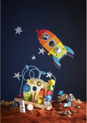 Frumoasă jucărie de însirat spațială, excelentă pentru dezvoltarea motricității fine la copii. Include 14 mărgele din lemn frumos ilustrate precum astronaut, lună, soare și rachetă.