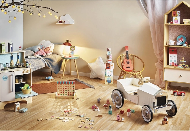 Realizată cu precizie din lemn lăcuit în Franța – jucărie durabilă, cu viață lungă și design atemporal.