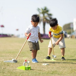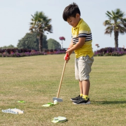 Diverse elemente și obstacole de mini-golf îi țin pe copii în mișcare și le stimulează îmbunătățirea preciziei și a tacticii de joc.
