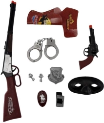 Transformați camera copilului într-o preririe a Vestului Sălbatic. Acest set de joacă pentru micii cowboy oferă tot ce este necesar pentru scenete pline de aventură – de la cătușele „de șerif” până la „colțul” care completează costumul și imaginația. Accesoriile ușoare și ușor de manevrat sunt adaptate mâinilor copiilor.