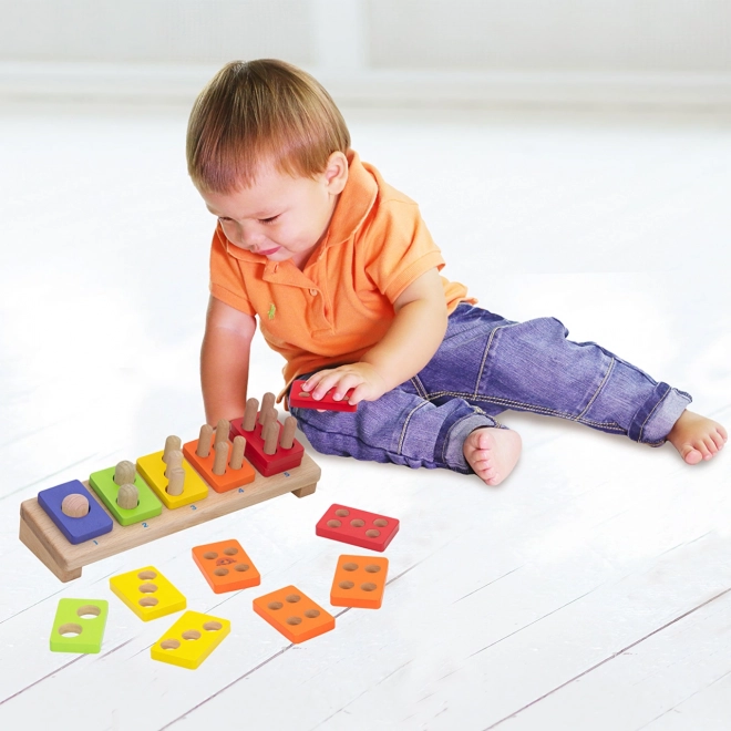 Această jucărie educativă din lemn de înaltă calitate îi învață pe copii să recunoască culorile și să înțeleagă ordinea numerelor 1–5. Fiecare plăcuță are un număr corespunzător de orificii, iar copiii le înșiră pe știfturile din bază, exersând astfel numărarea și gândirea logică.