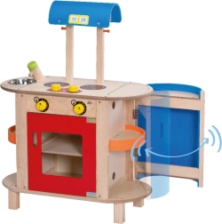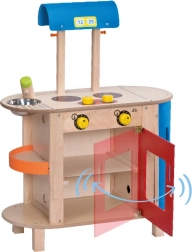 Bucătăria conține un aragaz multifuncțional cu cuptor încorporat și plită cu două ochiuri. Butoanele emit sunete de clic pentru o utilizare realistă.