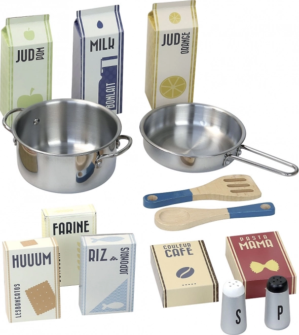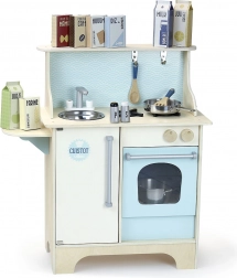 Datorită construcției robuste din lemn, bucătăria este stabilă și durabilă. Include bonetă și șorț de bucătar-șef, solniță și piper, spatulă/lingură de gătit, oală, tigaie și „alimente” în tetrapak – totul pregătit pentru gătit imaginar. După despachetare este necesară o asamblare simplă.