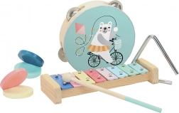 Setul conține tot ce este necesar pentru o mică orchestră de acasă: xilofon colorat cu baghetă, tamburină cu ursuleț, trianglu cu sunet clar și o pereche de castaniete confortabile. Datorită formei ergonomice, instrumentele se țin bine în mâinile mici și îi motivează pe copii să se joace muzical.