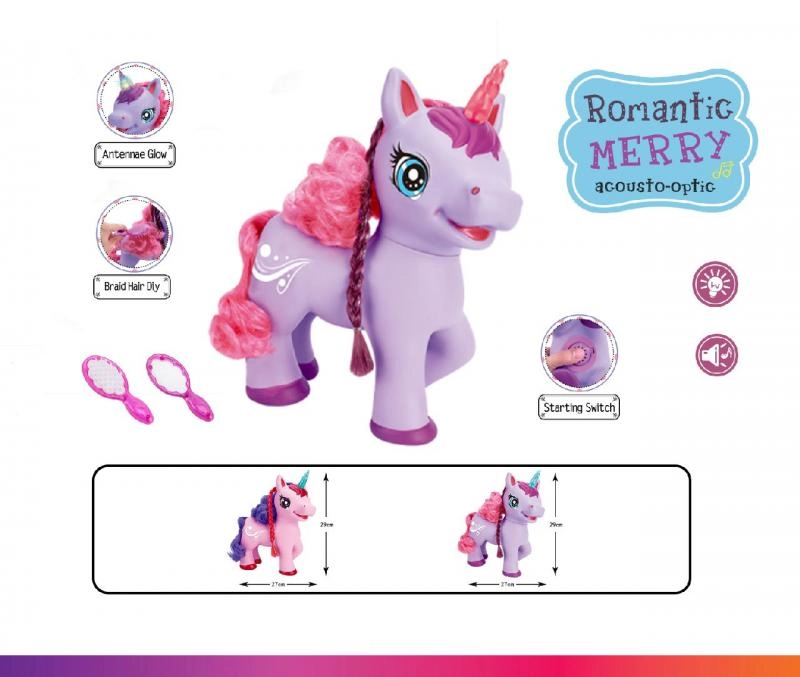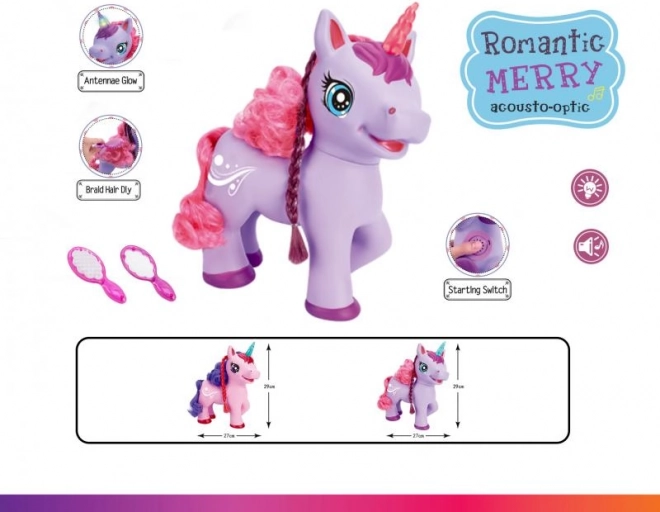 Un drăgălaș unicorn mov cu baterii îi va încânta pe copii cu efectele sale – la apăsarea butonului de pe burtică începe să cânte un cântec în limba engleză, scoate sunete magice și cornul i se luminează. Setul include un pieptene și o oglindă pentru pieptănarea coamei lungi.