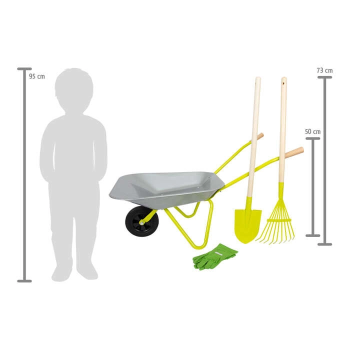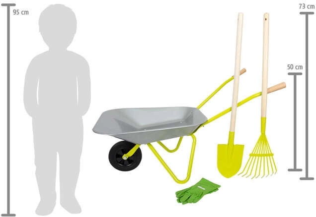 - Dimensiuni practice: roabă aprox. 79 × 36 × 50 cm, înălțimea mânerelor 50 cm; lungimea lopatei și a greblei aprox. 73 cm.