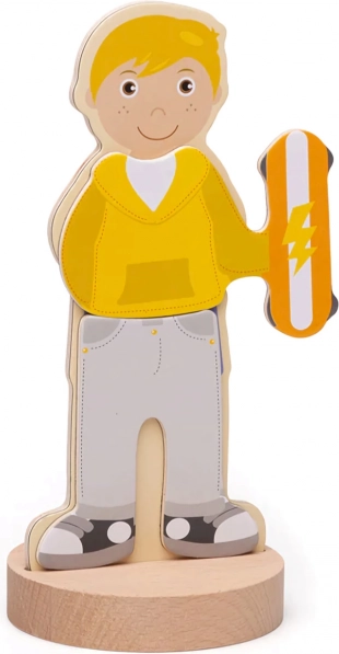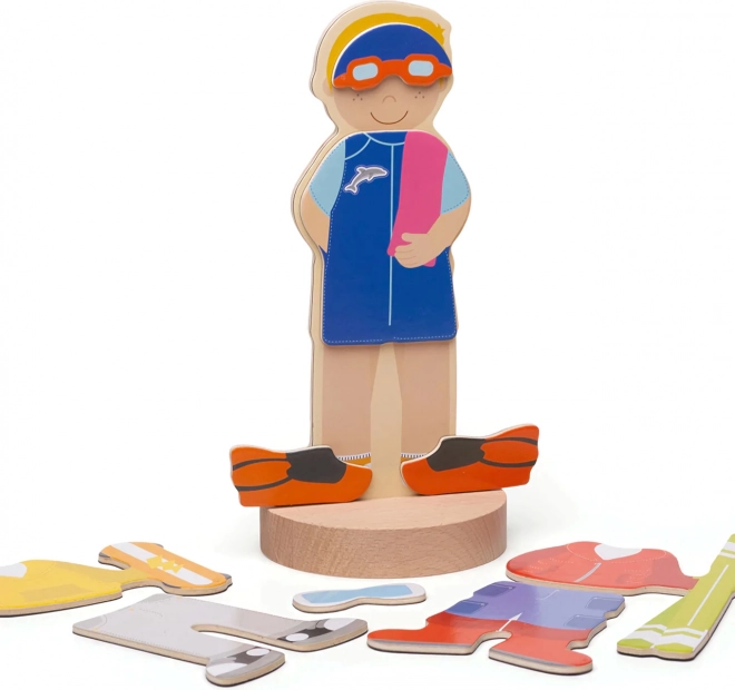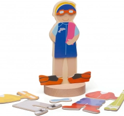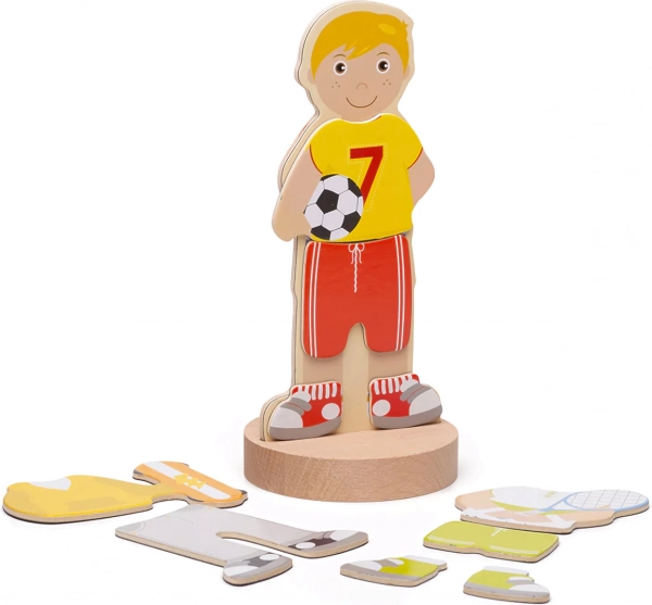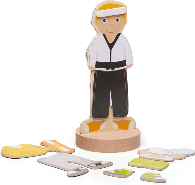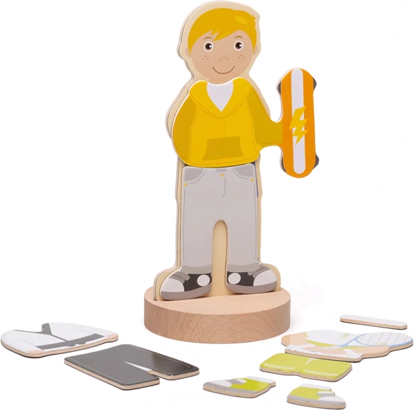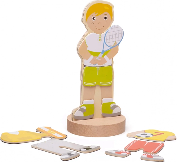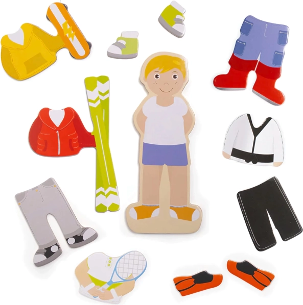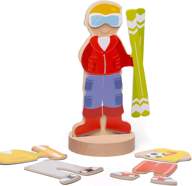 Puzzle-ul magnetic de îmbrăcat aduce copiilor distracție și învățare într-un singur produs. Datorită celor șapte combinații sportive, micii creatori pot mixa și potrivi hăinuțele, pot crea ținute unice și pot spune povești despre eroii lor. Cutia rezistentă cu capac magnetic păstrează toate piesele laolaltă – ideală pentru călătorii și pentru camera copilului.