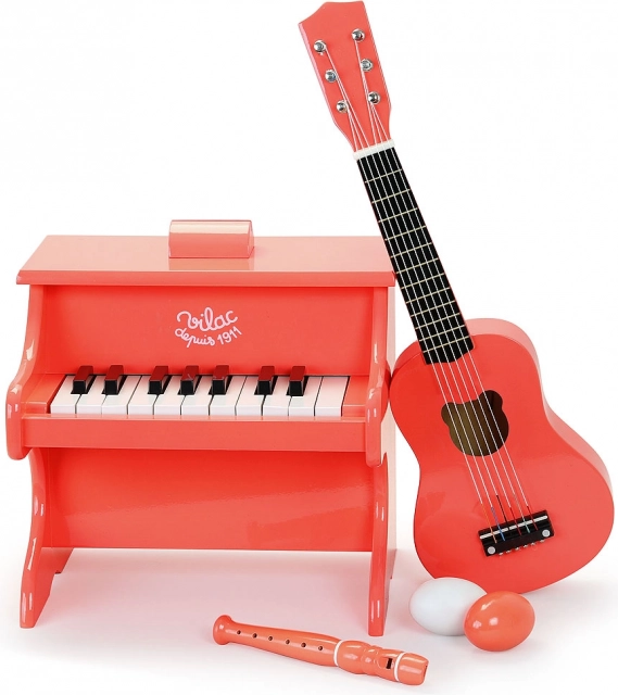 Chitara pentru copii VILAC, într-o nuanță portocalie vibrantă, este ideală pentru primele experiențe muzicale. Oferă execuție de calitate, 6 corzi din nylon și accesorii sub forma unei corzi de rezervă și a unui pană. Excelentă pentru dezvoltarea iubirii pentru muzică și ritm la copiii de la 3 ani. Atenție: este o imitație, nu un instrument muzical complet.