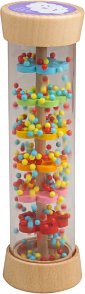 Cilindrul de ploaie Bigjigs Baby este o jucărie senzorială care îi atrage pe cei mici prin foșnetul său liniștitor și culorile vii. În interiorul cilindrului transparent, bilele trec peste discuri colorate, imitând o ploaie fină. Ambele capete sunt decorate cu motive drăguțe de soare și nor, care sprijină percepția vizuală.