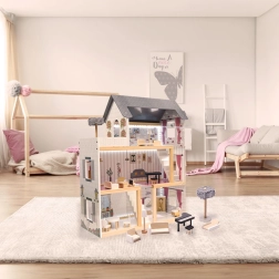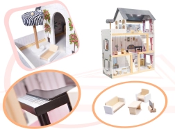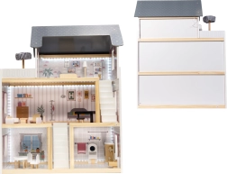Căsuța stilată pentru păpuși din MDF, în eleganta culoare neagră, oferă trei etaje pline de distracție, un set bogat de mobilier și o iluminare LED cu atmosferă plăcută. Datorită construcției solide din MDF este stabilă și rezistentă, iar cele 16 piese de mobilier permit amenajarea creativă a bucătăriei, livingului, dormitorului, băii și terasei de pe acoperiș.
