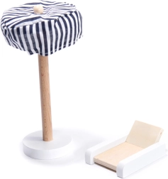 Terasa de pe acoperiș, cu șezlong și umbrelă cu dungi, este ideală pentru relaxarea păpușilor și completează scene realiste din viața de zi cu zi.
