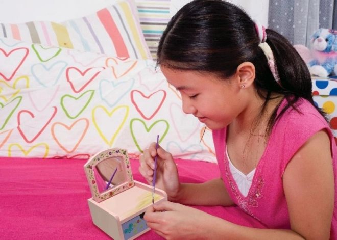 Descoperă bucuria creației cu această cutiuță cosmetică uimitoare. Acest set îți permite să vopsești și să decorezi propria cutiuță pentru mici comori, ideală pentru copii creativi.