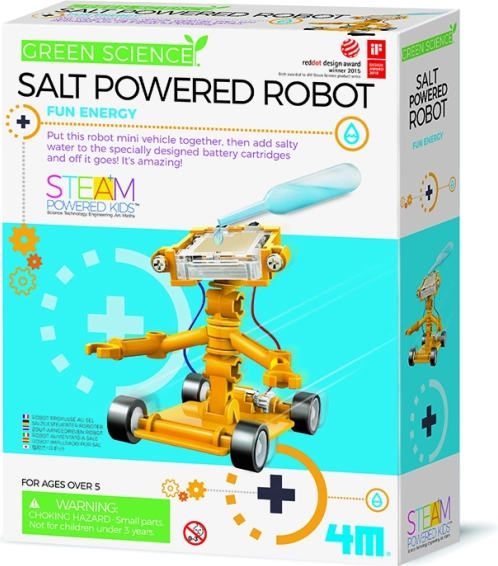 Robotul cu propulsie pe bază de sare este un set educațional care oferă un mod distractiv prin care copiii pot afla mai multe despre energiile alternative. Cu un robot care se mișcă datorită apei sărate, copilul tău se va transforma într-un mic inginer.
