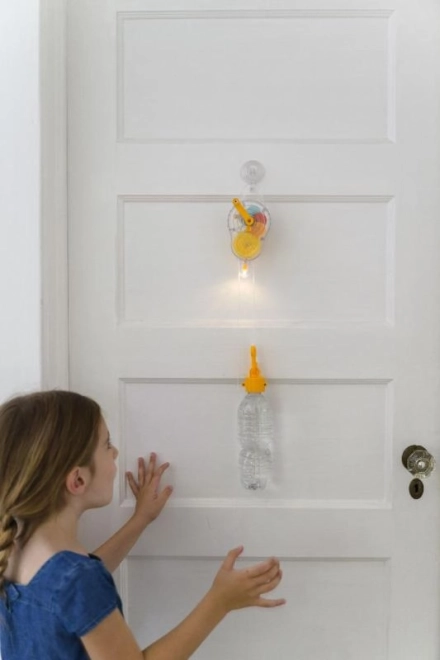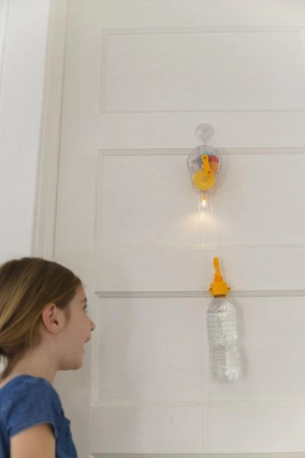 Agățați greutatea și urmăriți cum căderea transformă energia gravitațională în lumină. O demonstrație excelentă de fizică aplicată, pe care copiii o înțeleg imediat.