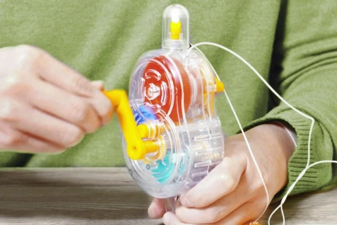 Învârtiți manivela și produceți electricitate prin propriul efort. Corpul transparent arată funcționarea angrenajelor în timp real.
