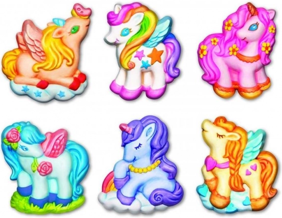 În acest set creativ, puteți forma și picta turnături din ghips. Produsul conține tot ce este necesar pentru a crea magneți sau broșe în formă de unicorni.