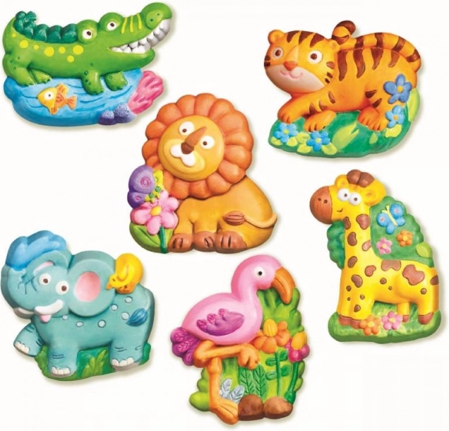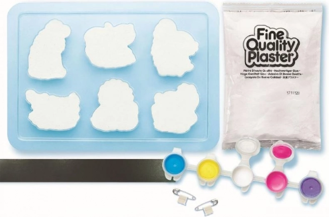 Setul include materiale pentru fabricarea mulajelor de gips pe care copiii le pot picta singuri. Conține o tavă cu forme din plastic și gips de calitate.