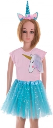 Acest costum fermecător va ilumina orice bal și imaginația celor mici. Fustița din tulle în stil balerină este ușoară, lucioasă și, datorită taliei elastice, se adaptează cu ușurință. Bentița este decorată cu un corn moale și urechiușe strălucitoare – accesoriul perfect pentru o mică zână sau vrăjitoare.