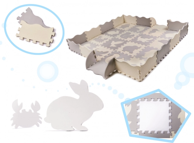 Piesele mari din spumă cu forme de animale detașabile susțin învățarea formelor, creativitatea și motricitatea fină. Din piese poți asambla ușor un covoraș plat sau un țarc cu margini ridicate, care delimitează o zonă sigură pentru joacă. Suprafața texturată este plăcută la atingere și nu alunecă.