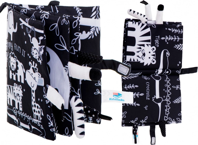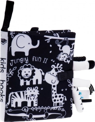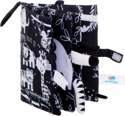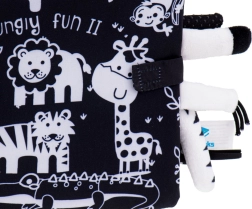 Această cărticică senzorială moale este un companion ideal pentru bebeluși de la 0+. Ilustrațiile safari alb–negru cu contrast (girafă, leu, elefant, maimuțică, tigruleț, crocodil) atrag atenția și susțin dezvoltarea corectă a vederii în primele luni. Cozile moi reliefate invită la explorare tactilă și exersează priza.
