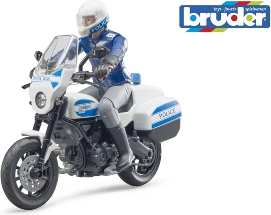 Motocicleta de poliție DUCATI Scrambler de la Bruder este un model elaborat pentru micii și marii fani ai serviciilor de salvare. Motocicleta are ghidon rotativ pentru manevrare ușoară și cric rabatabil pentru staționare stabilă. Figurina polițistului are membre mobile, astfel încât poate fi așezată în poziție de condus sau lângă vehicul.