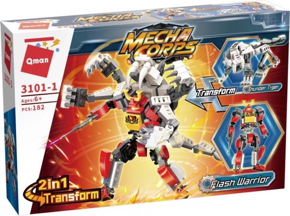 Qman Mecha Corps Flash Warrior 2în1 oferă două variante dinamice de construcție: un războinic ultra-rapid și tigrul său cercetaș. Animalul poate funcționa ca ajutor independent sau îl poți prinde pe spatele robotului pentru a-i spori echiparea și opțiunile în luptă. Datorită articulațiilor și detaliilor bogate, copiii se vor bucura de multă distracție plină de acțiune și de expunere în diferite poziții.