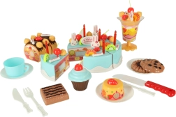 Acest set colorat cu tort aniversar albastru este ideal pentru jocurile de petrecere și pentru bucătăria de jucărie. Tortul este alcătuit din 6 felii unite cu bandă cu scai, astfel încât copiii îl pot tăia cu cuțitul din plastic inclus, îl pot rearanja și decora din nou. Accesoriile bogate – de la lumânări și fructe până la drăgălașii iepurași și inscripția „Happy Birthday” – stimulează creativitatea și dezvoltarea imaginației.