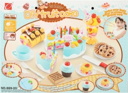 Cele șase felii ale tortului sunt unite cu bandă cu scai – copiii le pot tăia ușor cu cuțitul din plastic și le pun la loc. Ideal pentru exersarea motricității fine și pentru un joc realist.